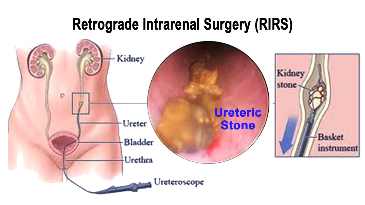 Retrograde Intrarenal Surgery (RIRS) : This procedure refers to surgery done inside the kidney with a viewing tube, better known as a fiber optic endoscope. Due to recent technological strides in this field, it has become possible to implement Retrograde Intrarenal Surgery (RIRS) to manage kidney stones. Using Retrograde Intrarenal Surgery Technology, this procedure can also be performed to remove kidney stones, which can be seen through the endoscope and later crushed or blasted using an ultrasound probe or evaporated using a laser probe or could be manually removed using a pair of small forceps