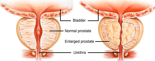 ENLARGED PROSTATE SYMPTOMS AND CAUSESIn men, urine flows from the bladder through the urethra. BPH is a benign (noncancerous) enlargement of the prostate that blocks the flow of urine through the urethra. The prostate cells gradually multiply, creating an enlargement that puts pressure on the urethra - the "chute" through which urine and semen exit the body.
