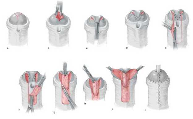 The open reconstruction of urethral stricture disease, also called urethroplasty, may involve surgery to remove the involved segment and re-attach the two normal ends. This is called excision and primary anastomosis. This procedure is best suited for short strictures involving the bulbar or membranous urethra in particular. When this repair is not possible, tissue can be transferred to augment and therefore widen the narrow segment to a normal caliber. For example, the urethra can be augmented using penile skin. Other tissues that can be used to reconstruct the urethra include a graft of buccal mucosa (skin inside the cheek). When the above procedures are not an option, alternatives include a two-stage repair where a buccal mucosa and/or a split-thickness skin graft is placed along the undersurface of the penis, and later rolled into a new urethra (neo-urethra). The choice of repair is individual and influenced by the length and location of the stricture, the availability of local tissue, and other factors.